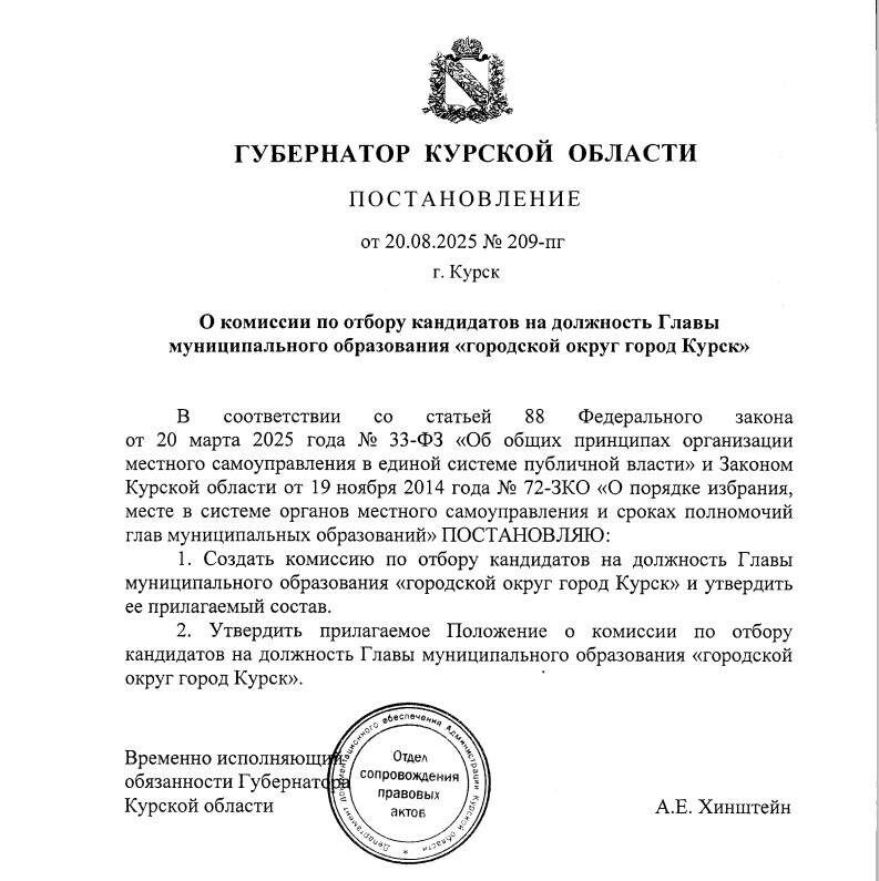 Врио губернатора Курской области Хинштейн утвердил состав комиссии по отбору кандидатов на должность главы Курска. Ее председателем стал ректор ЮЗГУ Сергей Емельянов. Зампредседателя - Иван Малков (председатель Курского городского совета ветеранов войны, труда, Вооруженных Сил и правоохранительных органов). Секретарь - Сергей Рябыкин (замдиректора департамента госслужбы Администрации Курской области). Кроме них, в состав комиссии по отбору кандидатов на пост главы Курска вошли: Андрей Кирьянов (замдиректора департамента администрации региона по профилактике коррупционных и иных правонарушений), Максим Калуцких (член курского избиркома), Сергей Шумаков (руководитель курского ОНФ) и главврач онкоцентра Углеша Станоевич. Комиссия будет оценивать кандидатов в мэры Курска и направлять свои решения врио губернатора.