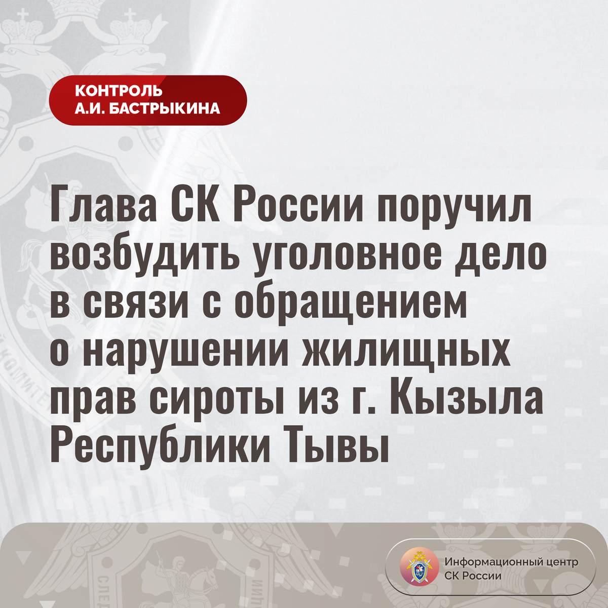 Глава СК России поручил возбудить уголовное дело в связи с обращением о нарушении жилищных прав сироты из г. Кызыла Республики Тывы К Председателю СК России А.И. Бастрыкину через Информационный центр обратилась сирота из города Кызыла Республики Тывы по вопросу длительного непредоставления ей положенного по закону жилья. С 2006 года женщина состоит на учете лиц, подлежащих обеспечению жилыми помещениями. Несмотря на вынесение судом решения в пользу заявительницы, мер к реализации ее прав не принимается. В связи с этим сирота вынуждена арендовать квартиру за свой счет, что для нее финансово затруднительно. Многочисленные обращения в различные инстанции результатов не принесли. Председатель Следственного комитета Российской Федерации Александр Иванович Бастрыкин поручил руководителю СУ СК России по Республике Тыве Константину Владимировичу Столбину возбудить уголовное дело и представить доклад о предварительных и окончательных результатах его расследования. Исполнение поручения поставле