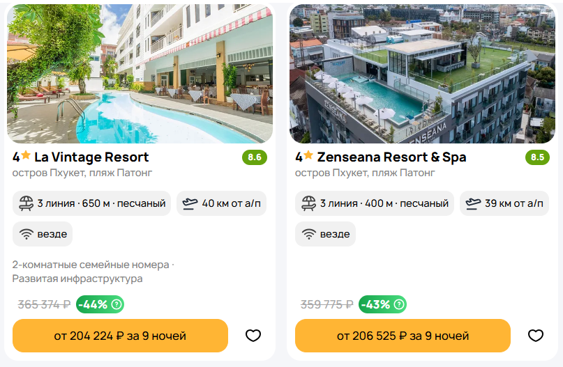 🔥 Горящие туры в Таиланд "всё включено" из Москвы на 7-14 ночей🔥 Парочка выгодных вариантов: Тур в отель 4⭐️La Vintage Resort, до пляжа 650 м, Пхукет, от 9 ночей, всё включено, регулярный рейс. Вылет 23 августа, от 102112 руб/чел Забронировать: https://checkintime.ru/lrsp Тур в отель 4⭐️Zenseana Resort & Spa, до пляжа 400 м, Пхукет, от 9 ночей, всё включено, регулярный рейс. Вылет 23 августа, от 103263 руб/чел Забронировать: https://checkintime.ru/5uej Тур в отель 5⭐️Graceland Khaolak Beach Resort, до пляжа 530 м, Као Лак, от 9 ночей, всё включено, регулярный рейс. Вылет 23 августа, от 115617 руб/чел Забронировать: https://checkintime.ru/rdxw Все предложения: https://checkintime.ru/vgcq ⚠️Цены на момент публикации и указаны на одного человека с перелетом и проживанием. Переходя по ссылке цена отобразиться на 2-х человек 🏖 Поиск туров | ✈️Авиабилеты