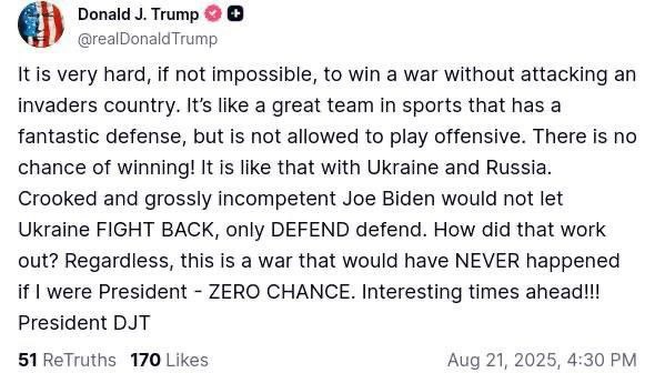 Наоборот же, он пишет, что у Украины нет шансов победить.