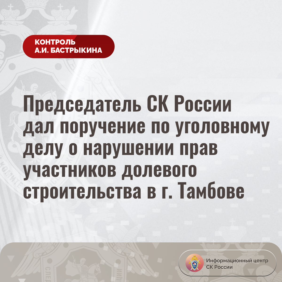 Председатель СК России дал поручение по уголовному делу о нарушении прав участников долевого строительства в г. Тамбове