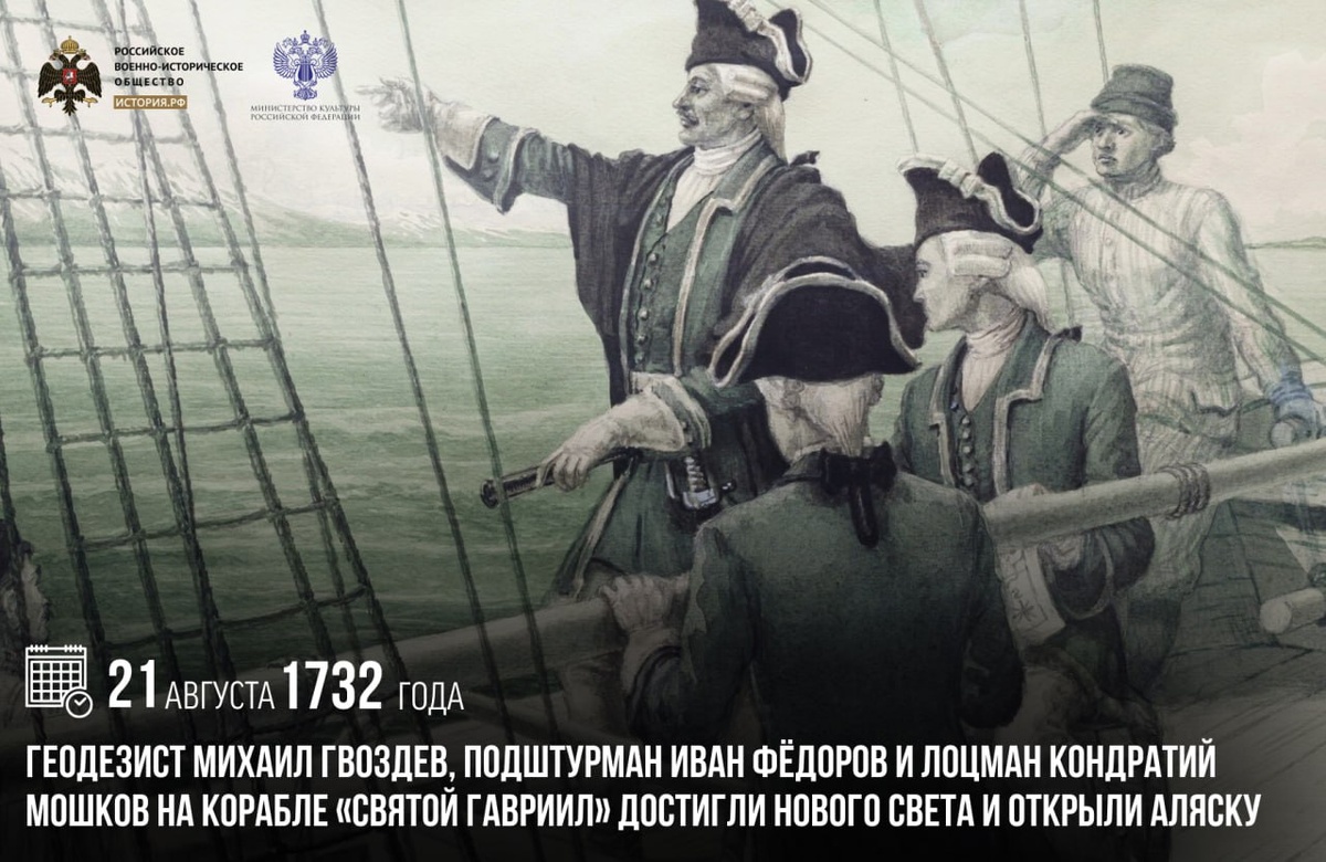 21 августа 1732 года геодезист Михаил Гвоздев, подштурман Иван Федоров и лоцман Кондратий Мошков на корабле «Святой Гавриил» достигли Нового Света и открыли Аляску Экспедиция началась за месяц до этого — 23 июля. Тогда «Святой Гавриил» вышел из устья реки Камчатки. Команда корабля состояла из 39 человек. Интересно то, что ни один из участников экспедиции не имел карты района, куда совершалось плавание. Уже 15 августа экспедиция вошла в Берингов пролив, а через шесть дней достигла мыса Принца Уэльского, который до 1778 года назывался в честь Михаила Гвоздева. Он располагается на полуострове Сьюард, который является частью Аляски. Вскоре экипажем корабля было принято решение о возвращении. #памятныедаты_ИсторияРФ Подписаться на История.РФ