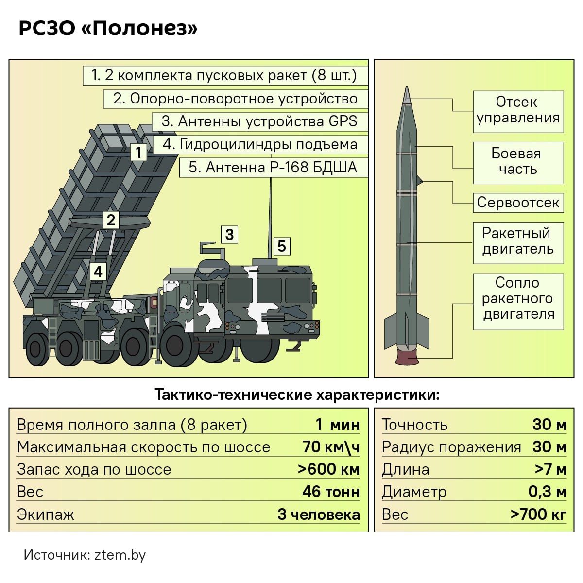 В ответ на пост Реактивная система залпового огня "Полонез": характеристики и вооружение После совещания у президента Беларуси по ракетному производству госсекретарь Совбеза Александр Вольфович сообщил, что сейчас рассматривается вопрос оснащения РСЗО "Полонез" ядерными боеголовками. "Полонезы" приняли на вооружение в 2016 году, с тех пор РСЗО уже пережила модернизацию. Система установлена на шасси белорусского предприятия МЗКТ. Подробнее — в инфографике @SPUTNIKBY.