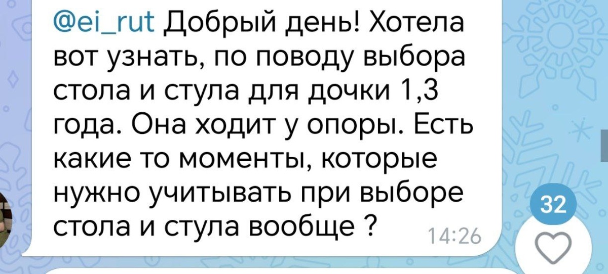 🎈Выбор стола и стула Исходим из высоты стула - ножки ребёнка достают до пола, стопы полностью стоят и полноценно опираются в пол. Ребенок может уверенно самостоятельно сесть и встать Высота стола подбирается исходя из положения ребёнка на стуле 🌈Исходя из условий рынка и индивидуальных особенностей развития ребенка: 1. Чаще всего мы берем то, что предлагается на рынке. Как правило это варианты выше, чем нужно на момент готовности ребека сидеть на стуле. Тогда пользуемся столом и стулом кратковременно и под наблюдением взрослого С момента самостоятельной уверенной ходьбы столик точно может быть в зоне доступа для игры на нем Стул - по обстоятельствам и степени шилопопства конкретного ребенка 2. При необходимости организации игры в положении сидя с целью снижения времени пребывания в неправильных позициях (например, когда ребенок предпочитает играть сидя в w, z, круглая спина мы можем предложить изменить условия игры) - в таких случаях ищем подходящие по росту стул и стол, учим ими п