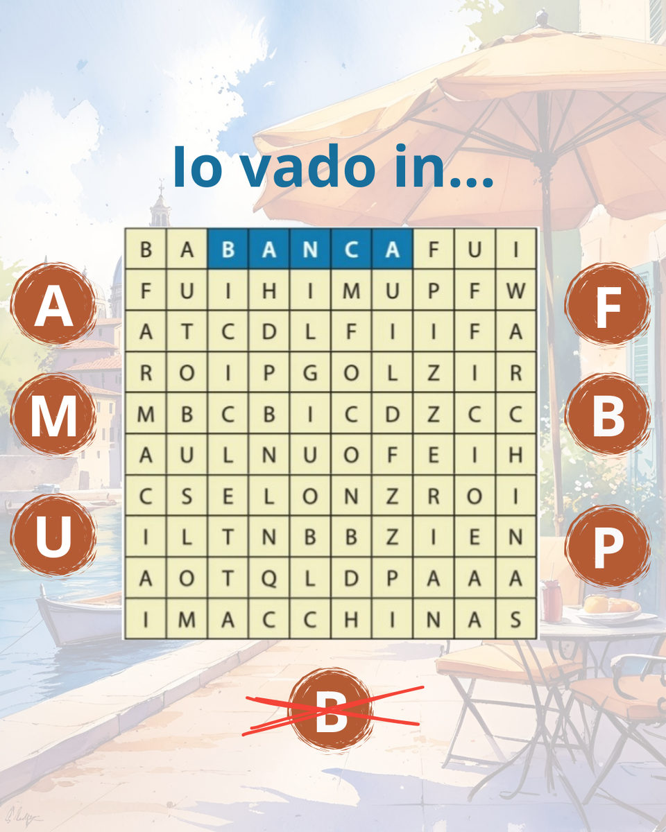 Подсказка: первые слова - Banca и Stazione уже найдены, начальные буквы остальных слов отмечены в кружочках 🤗