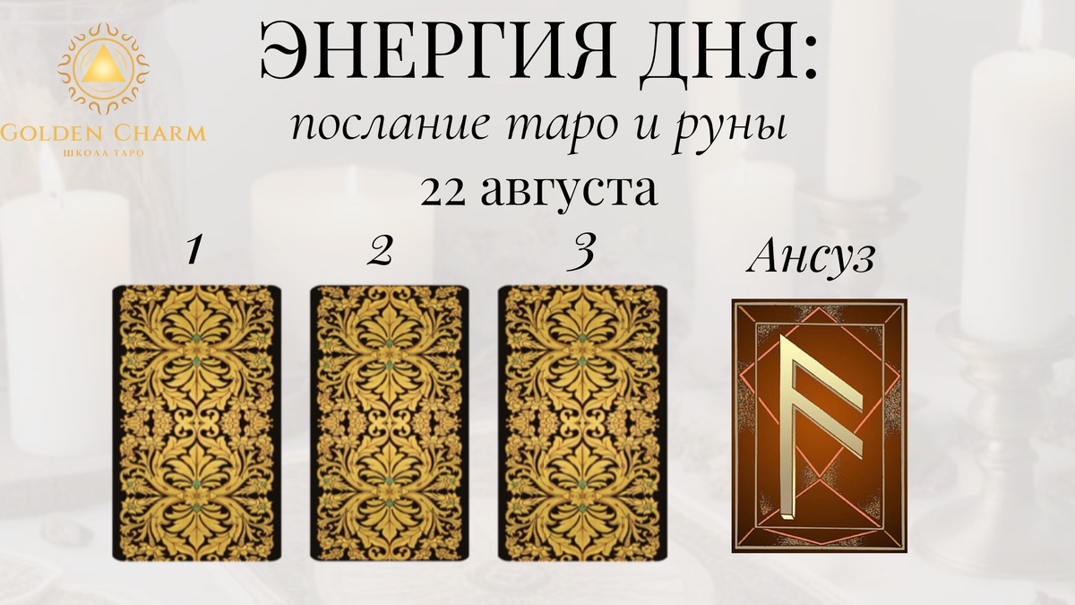 Заказать личный расклад тут✅ Прогноз на 22 августа : что тебя ждёт Приходи на обучение Таро ✅ Выбери карту — 1, 2 или 3 — и узнай, какой путь для тебя: 1. 10 жезлов Возможно, сегодня ты столкнешься с препятствиями или почувствуешь усталость. Но помни, что преодоление трудностей делает тебя сильнее. Не бойся просить помощи и делись своей ношей с близкими людьми. 2. 2 кубков Ожидай приятных встреч, новых знакомств или сближения с любимым человеком. Сегодня хорошо обсуждать чувства, делиться эмоциями и строить планы вместе. 3. Сила Ты сможешь справиться с любыми проблемами благодаря внутренней силе и решительности. Используй этот потенциал для достижения целей и реализации желаний. Руна дня — АНСУЗ День благоприятствует обучению, новым знаниям и общению с мудрыми наставниками. Будь открыт новому опыту. Напиши цифру карты + АНСУЗ в комментариях, чтобы активировать энергию. Хочешь личный расклад? Пиши — посмотрим, что ждёт тебя: Заказать личный расклад тут✅ Обучение Таро и Рун