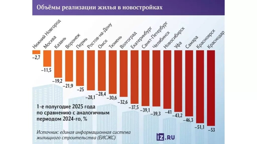 Так, «Известия» пишут, что, по данным ЕИСЖС, из городов-миллионников сильнее всего продажи жилья упали в Краснодаре — на 53% В Красноярске — на 51%, в Самаре — на 46,3%, Уфе — на 43,2%, Новосибирске — на 41%, Челябинске — на 39,3%, Санкт-Петербурге — на 39% и Екатеринбурге — на 37,5%. Наименее пострадавшими оказались Москва — 11,5% и Нижний Новгород — 2,7%.