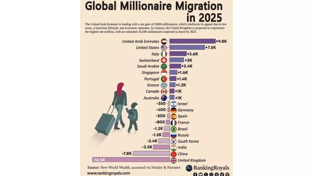 ОАЭ становится мировым финансовым центром. При этом наибольший чистый отток состоятельных частных лиц (HNWI) зафиксирует Великобритания — 16,5 тыс. человек — более чем вдвое превышая ожидаемые 7,8 тыс. из Китая. За пределами Европы спрос со стороны состоятельных лиц из Великобритании, Индии, России, Юго-Восточной Азии и Африки, подкрепленный привлекательными программами золотых виз, укрепил позиции ОАЭ как ведущей мировой юрисдикции для частного капитала. Поэтому ОАЭ сохраняют статус главного центра притяжения денег — ожидается рекордный приток в 9,8 тыс. миллионеров.
