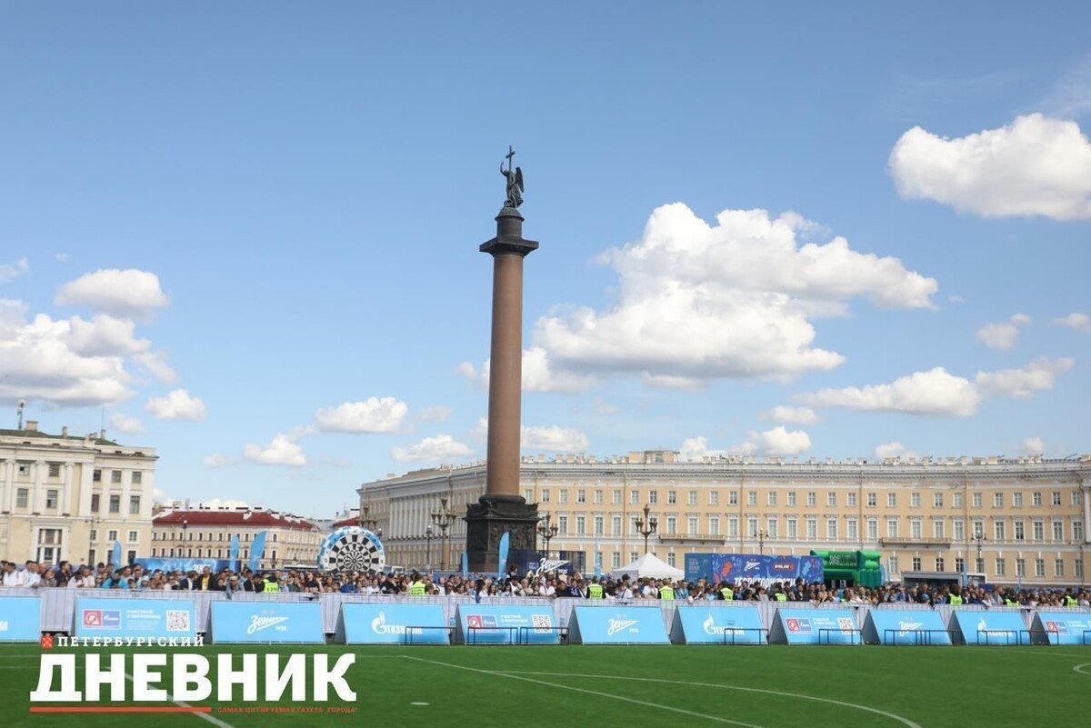 Понаблюдать за футболистами собралось немало зрителей. Они поддерживали спортсменов и наблюдали за тем, как игроки тренируются на поле в самом сердце Петербурга вместе с детьми.