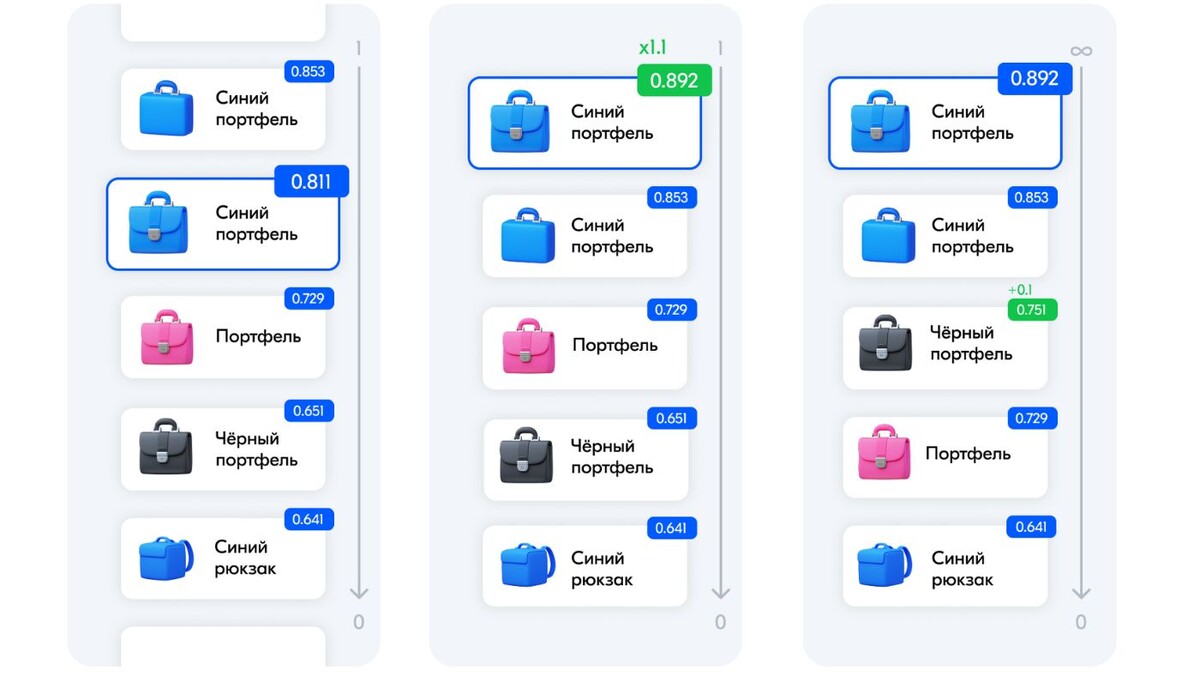 После прохождения трёх этапов поиска товар с названием «синий портфель» получает оценку 0,811. Если это товар с выгодным индексом цен, к нему будет применён бустинг — например, 1,1. В этом случае итоговая оценка : 0,811 × 1,1 = 0,892. Если товар подходит под условия нескольких бустингов, коэффициенты бустингов суммируются.