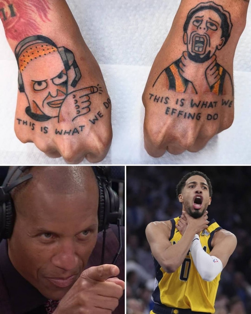 Тату фаната Индианы с отсылкой к матчу плей-офф с Нью-Йорком, в котором Халибёртон повторил легендарный удушающий жест Рэджи Миллера.