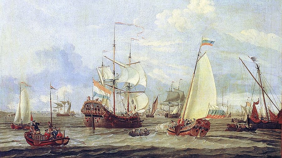В 1697 году из России в Европу направилось Великое посольство с целью сформировать против Османской империи коалицию европейских держав. В составе делегации был и «урядник Петр Михайлов», который целых полгода работал плотником на верфях Амстердама. Только оказавшись в Голландии, русские поняли, чего им недостает, чтобы стать в один ряд с ведущими европейскими странами, и восхищенный всем голландским царь Петр перенял флаги довольно гостеприимных в ту пору хозяев. Во всяком случае на картинах местного художника Абрахама Сторка «Прибытие Московского посольства в Амстердам 29 августа 1697 года» и «Визит Петра I в Амстердам, август-сентябрь 1697 года» на русских кораблях изображены трехцветные вымпелы.