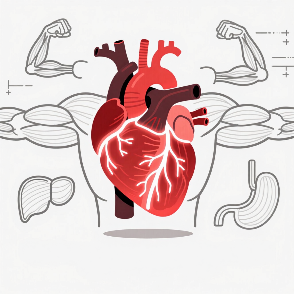 Но на самом деле самая главная мышца, от которой зависит не только спорт, но и жизнь, — это сердце. В метаанализе 2020 года было показано: у людей, выполняющих хотя бы 150 минут умеренной активности в неделю, риск смерти от сердечно-сосудистых причин ниже на 33%. Если мышцы можно "отдыхать", то сердце работает всегда. Слабое сердце — это ограничитель №1 даже для самой мощной физической формы. 👉 Это улучшает работу сердечной мышцы и укрепляет сосуды. Исследования показывают: умеренные силовые нагрузки снижают риск ССЗ, укрепляют сосуды и помогают контролировать давление.