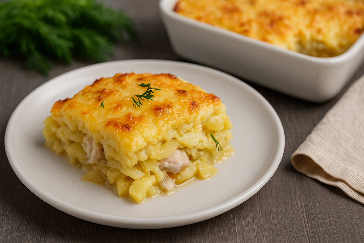 Форму для запекания смажьте растительным маслом. На дно выложите слой картофеля, затем немного лука. Сверху — кусочки пан