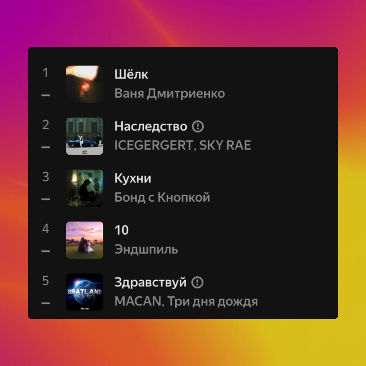 👑 🎵 Песня группы Бонд с кнопкой «Кухни» — больше не на первом месте чарта Яндекс.Музыки И сместил её даже не MACAN, и даже не ICEGERGERT со SKY RAE, а Ваня Дмитриенко с песней «Шёлк». Вот так вот 👀 @mainstreamusic