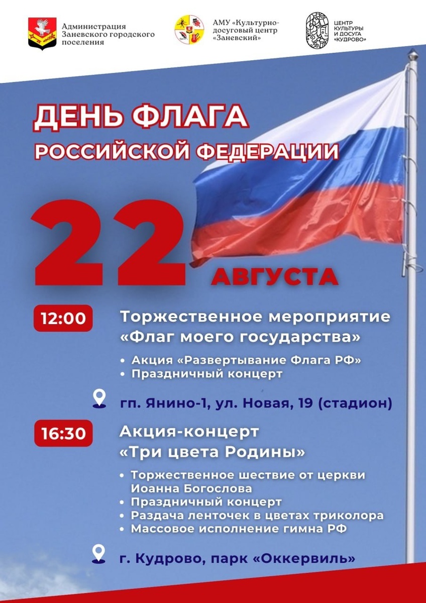 Дорогие друзья! Приглашаем вас принять участие в мероприятиях, посвящённых Дню Государственного Флага Российской Федерации. Российский триколор – главный символ нашей страны. Он хранит память поколений, объединяет граждан, дарит чувство гордости. Патриотические акции состоятся в Янино и Кудрово. На муниципальном стадионе проведут церемонию развертывания флага и праздничный концерт, наполненный песнями и музыкальными композициями, воспевающими нашу великую Родину. ℹ️В молодом городе все желающие приглашаются к участию в торжественном шествии с флагами от церкви Иоанна Богослова до амфитеатра в парке «Оккервиль», где состоится концерт. На празднике можно будет получить ленточку-триколор и присоединиться к массовому исполнению гимна России. Сбор у церкви в 16:30. ❗️Начало завтра в 12:00❗️ Заневское городское поселение ДТП и ЧП Кудрово