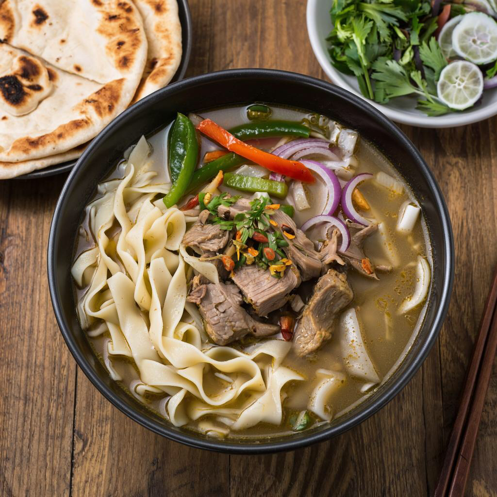 Что касается лапши, — это один из ключевых элементов лагмана. Тесто готовится из муки, воды, соли и иногда яиц. Его нужно тщательно вымесить, оставить для отдыха на 30 минут, затем раскатать тонко, нарезать полосками шириной 1-2 сантиметра или более тонко. Некоторые традиционные рецепты предусматривают руками вытягивание или раскатывание теста в очень тонкий пласт. Лапшу можно варить вместе с бульоном, положив в кастрюлю за 10 минут до окончания, либо жарить на сковороде до золотистой корочки. Вариант с тонкой лапшой отлично подходит для подачи в качестве самостоятельного блюда или дополнительно к бульону.
