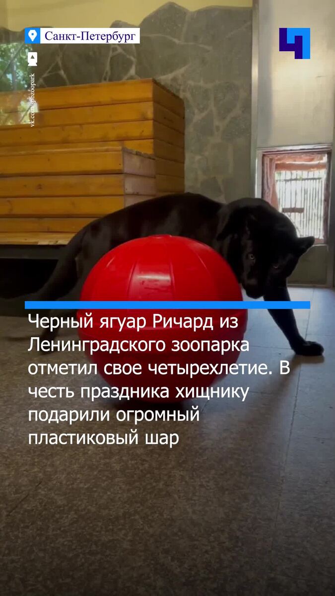 В Ленинградском зоопарке чёрный ягуар Ричард отметил свое четырехлетие. К празднику ему подарили большую игрушку — пластиковый шар. Сначала именинник отнесся к подарку настороженно, но вскоре увлекся: катил шар по вольеру и проверял его прочность лапами и клыками. Сотрудники зоопарка напоминают: Ричард обожает крупные игрушки, особенно бочки и коробки, но они редко выдерживают его натиск. Вероятно, и новый шар скоро станет плоским "блинчиком".