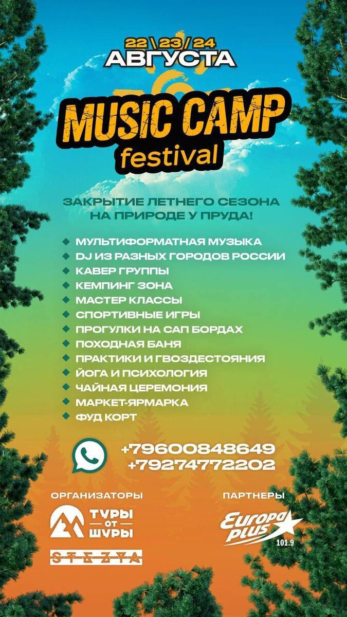 ФЕСТИВАЛЬ MUSIC CAMP 2025🏕️🫶🏻🤗🔥🎧🪇❤️ https://t.me/+zL7Dvam4rT8zNGRi 🌟Что будет на ФЕСТИВАЛЕ: 3 дня и 2 ночи на природе в лагере с активностями: - Три зоны танц пола (главная сцена, акустическая сцена, зона After Party) - dj со всей России - кавер группы - катание на сап бордах - баня и парение - яркая шоу программа - песни у костра - зона Ярмарки - мастер классы - фуд корт - новые знакомства 📍Место проведения: Мияшево https://2gis.ru/nabchelny/geo/70000001074569234/52.976425,55.742260 ❗По вопросам участия звоните: +79600848649