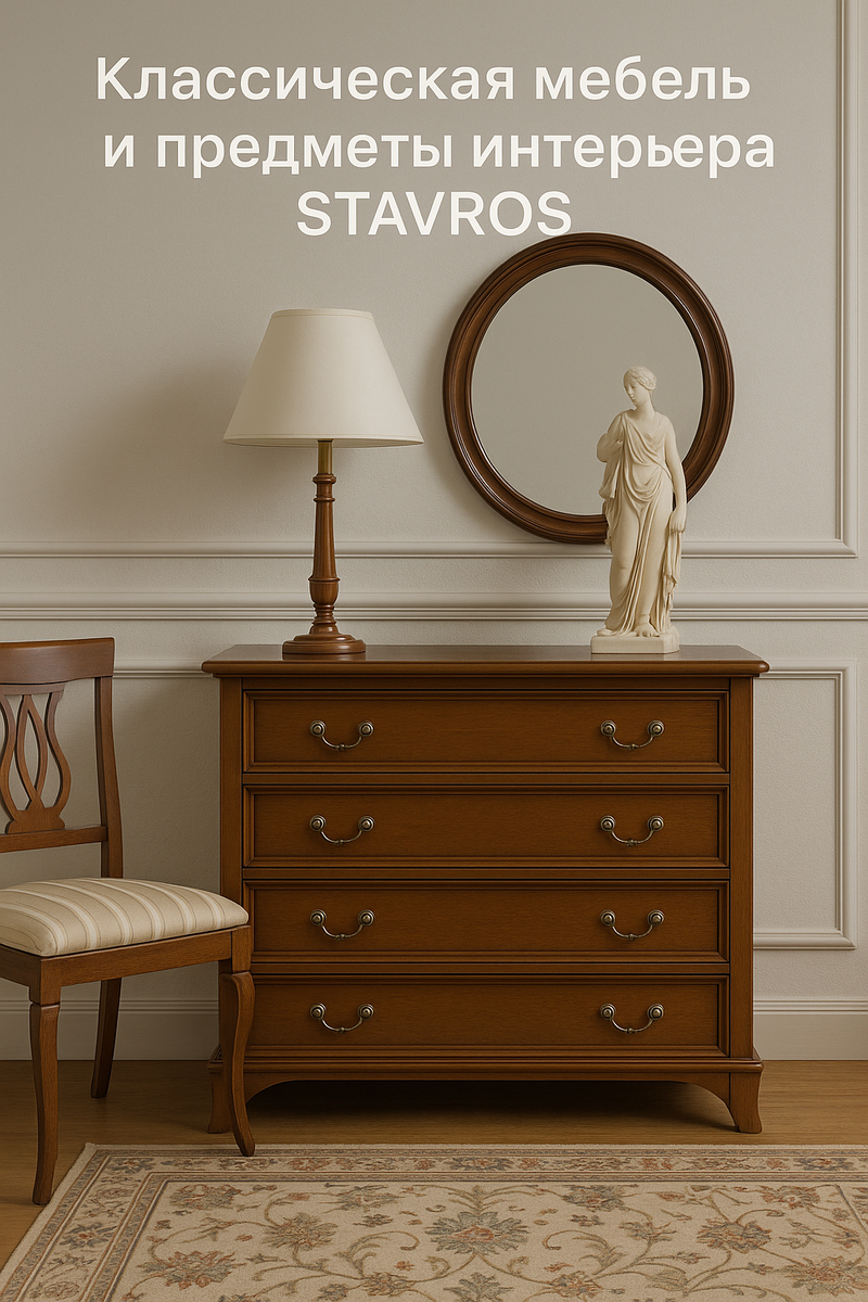 Классическая мебель STAVROS — изысканные столы, кресла, банкетки, консоли, зеркала, тумбы прикроватные, туалетные столики и декоративные аксессуары из массива дерева с резными деталями. Индивидуальные параметры, богатая отделка и полная кастомизация — создайте интерьер, который отражает ваш статус и безупречный вкус.