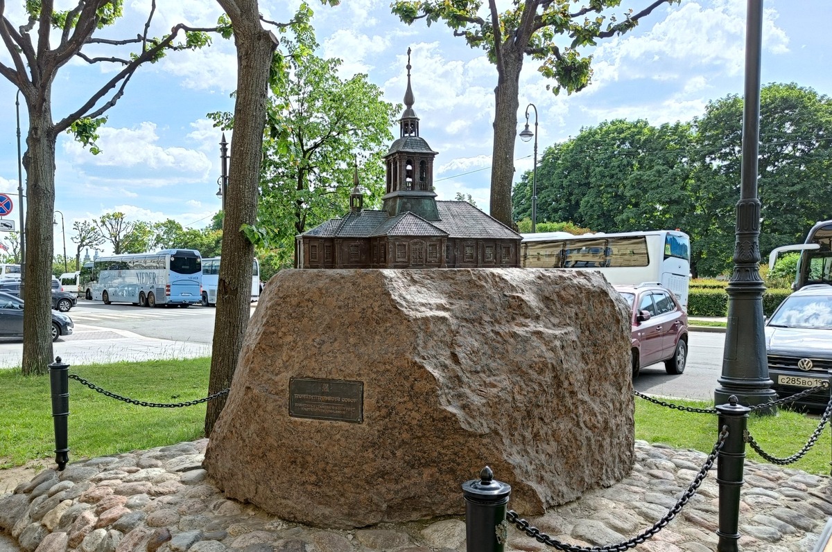 О былых временах на площади напоминает немногое. В 2020 году на месте, где стоял первый храм города, поставили его миниатюрную копию из бронзы. Поставили не на какой-то случайный булыжник, а на кусок Гром-камня, из которого выпилили пьедестал для Медного всадника.