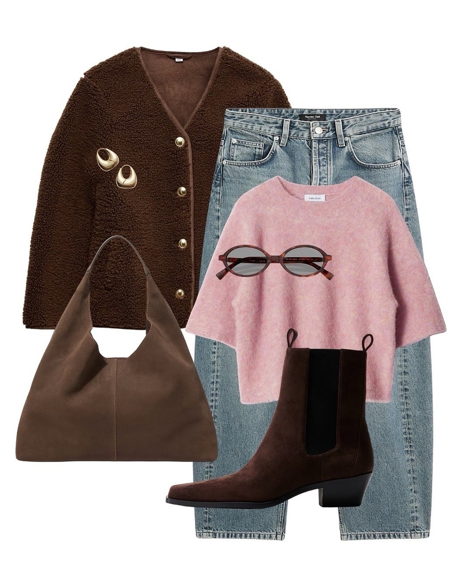 Осень — сезон текстур. Именно они делают комплект визуально «дорогим»: мягкий ворс, тактильная замша, зернистый деним и тёплый блеск металла. На фото — идеальная формула: пыльно-розовый как настроение, шоколад как опора и светлый деним как лёгкость. Ниже — подробный разбор каждой находки и советы стилиста, чтобы вы сразу могли повторить и адаптировать образ под себя.