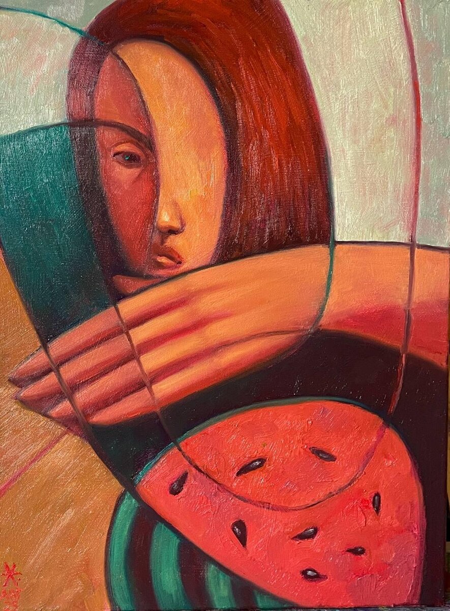 Как оказывается сложно делать НЕидеально. Должно же быть наоборот. Сделать коряво потребует значительно меньше усилий, концентрации, навыков, знаний и времени. А самое главное — ОНО БУДЕТ СДЕЛАНО. Есть ли она вообще, эта идеальность, хоть в чем-то? Нужна ли она? Может весь изюм нашей жизни в её несовершенстве? В ошибках, в спонтанных решениях, в прочем тяп-ляпе? Неидельное говорит о нас гораздо больше, чем доведённое до глянцевого блеска нечто. Любая идеальная лента в запрещенной инсте имеет сто идентичных аналогов и их легко перепутать, а какой-нибудь одногруппник, выкладывающий всратые фотки, заставляет улыбнуться. Делайте неидеально. Главное — делайте. «Арбуз на столе» холст/масло, 30х40, авугст 2025