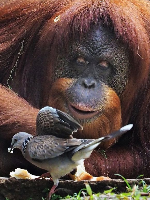 Орангутан заботливо кормит голубка: