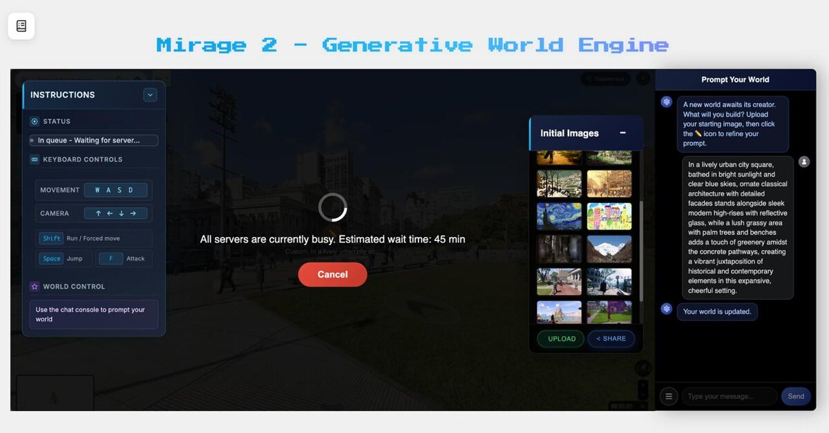 Новая модель мира 😎 Называется Mirage 2. Уже есть готовые интерактивные миры, а еще можно загрузить свое изображение. Я загрузил скриншот из гугл-карт. Пишет, что на генерацию уйдет 45 минут, но что-то мне подсказывает, что я буду ждать сильно дольше. Очень интересно что из этого выйдет. #worldModel@TochkiNadAI