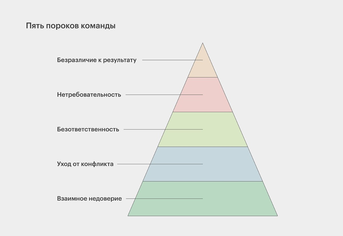 Как сделать команду успешной? Для начала понять что делает вашу команду неуспешной. Для этого существует пирамида Ленсиони. Просто исправьте это! Взаимное недоверие. Сотрудники скрывают правду и о собственных трудностях, и о проблемах в работе? Отчёты, которые получает менеджмент, сильно приукрашены и не соответствуют действительности? Они не хотят открываться, потому что боятся наказания от руководства или проблем с другими членами команды. Может уже перестать запугивать подчиненных? Боязнь конфликта. Команда копит обиды, внутри неё процветают интриги, а работники не прислушиваются к мнению друг друга? За видимой гармонией скрыт идеологический конфликт — отсутствие согласия, что и зачем нужно делать? В итоге команда не решает самые важные вопросы. Боязнь конфликта — следствие первого порока, взаимного недоверия. Конфликты необходимы для развития здоровых отношений. Это касается не только командной работы, но и дружбы или брака. Входите в конструктивные конфликты! Страшно, да? А по