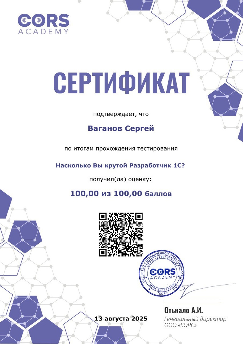 #Новости #CORS На CORS платформе появился интересный опрос для определения вашего уровня как разработчика 1С, и называется он "Насколько Вы крутой разработчик 1С?". Для определения уровня необходимо ответить на 25 вопросов. Опрос можно пройти по ссылке https://school.cors.su/local/crw/course.php?id=207 Конечно, я тоже попробовал свои силы, в результате получил сертификат. Мои социальные сети