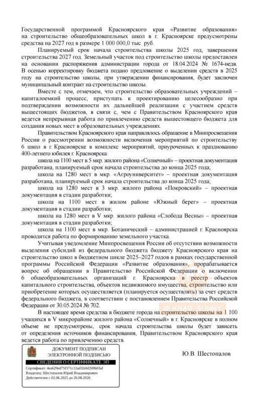 🔤🔤🔤🔤🔤Долгожданной школы в красноярском Солнечном в ближайшее время никто не построит. На это просто нет денег. Население микрорайона серьёзно озадачилось после того, как в местном паблике была опубликована такая новость. Прежде они жили с мыслью, что в этом году начнётся обещанное строительство школы на 1 100 мест в 5-м микрорайоне. После ответа краевого Минстроя всякая надежда рухнула. Из него следует, что в настоящее время готова проектная документация и получено положительное заключение госэкспертизы. Сметная стоимость строительства объекта на 4 квартал 2024 года составляла 2 505 675,3 тыс. руб., но как раз их-то в бюджете и нет. Госпрограммой края «Развитие образования» на строительство школ в Красноярске предусмотрены средства на 2027 год в размере 1 000 000,0 тыс. руб. В ответе говорится, что региональное правительство обращалось за федеральным финансированием к Минпросвещения, но получило отказ в получении субсидий. Планируется обращение к Правительству РФ. Сегодня у люде