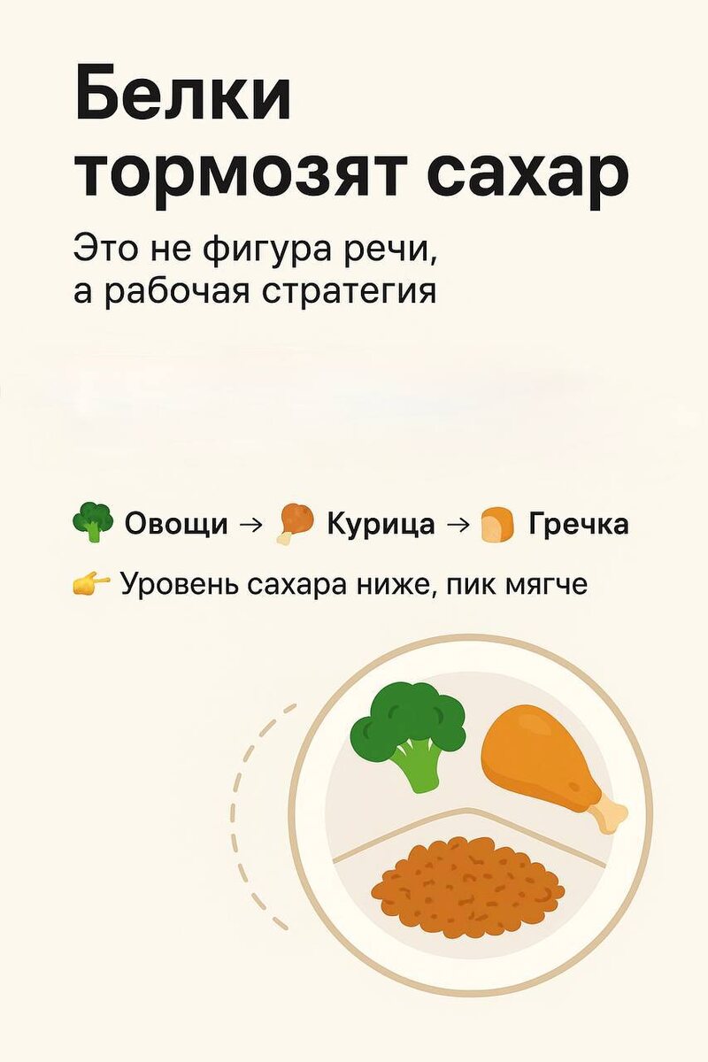 Белки тормозят сахар. И это не фигура речи, а рабочая стратегия. Когда в тарелке сначала овощи, потом белки, а углеводы — в конце, глюкоза в кровь поступает медленнее. Пример: 🥦 брокколи → 🍗 курица → 🍞 гречка 👉 Пик сахара ниже, возвращение к норме — мягче. Почему так? Клетчатка из овощей и белок замедляют опустошение желудка. Углеводы встречают «трафик» на входе — и не прорываются резко в кровь. Инсулину проще «поймать» глюкозу, когда она приходит не толпой, а порциями. 💡 Лайфхак: попробуй в течение недели менять порядок еды и замеряй сахар после приёмов пищи. В понедельник — ешь всё вперемешку. В среду — овощи и белок до углеводов. Сравни графики. 📲 В FreeLife это легко: фиксируй приёмы пищи, замеры сахара и смотри, как меняется кривая. Данные сами расскажут, что тебе подходит. Подключайся 👉 https://free-life.app — и узнай, как управлять своим сахаром не только дозами, но и порядком еды. Все наши статьи адаптированы под разные типы диабета. Учитывайте рекомендации врач