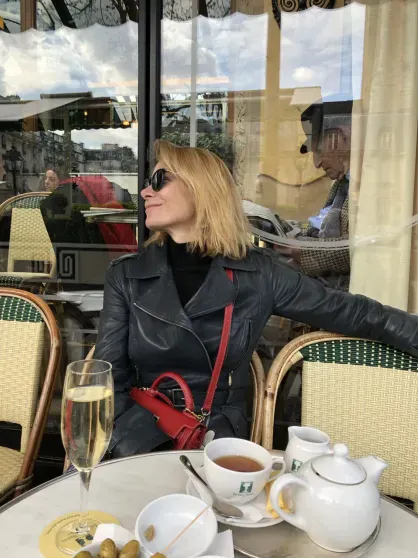 Что за манера прибухивать с утра, не понимаю?Да еще и демонстрировать снимки широкой общественности... Ну, любишь ты Париж и таскаешь туда на романтические свидания этого бедного старика, который уже и сам не очень хорошо понимает, где он находится - ему что Монмартр, что чебуречная возле станции метро "Выхино", неважно - и молодец. А зачем рассказывать об этом широкой общественности? Я вообще считала, что до 18:00 приличные люди не пьют. А тут тебе и чай, и шампанское, и оливки. Вы пьете чай с оливками? Это, видать, такой парижский изыск. Как яичница с брусничным вареньем! "Я всегда хочу в Париж. Долгие прогулки по набережным, сhausson aux pommes из кафе Carette — по форме вобла воблой, а на вкус лучше не бывает, ледяное шампанское, зелёные стулья Люксембургского сада и, конечно, любимый рядом. В общем, romantique в идеальном о нём представлении", - сообщила нам Юля о своих приоритетах. Сhausson aux pommes... Да напиши ты - пирожок с яблоком, да и все. Понахватаются в Парижах своих и