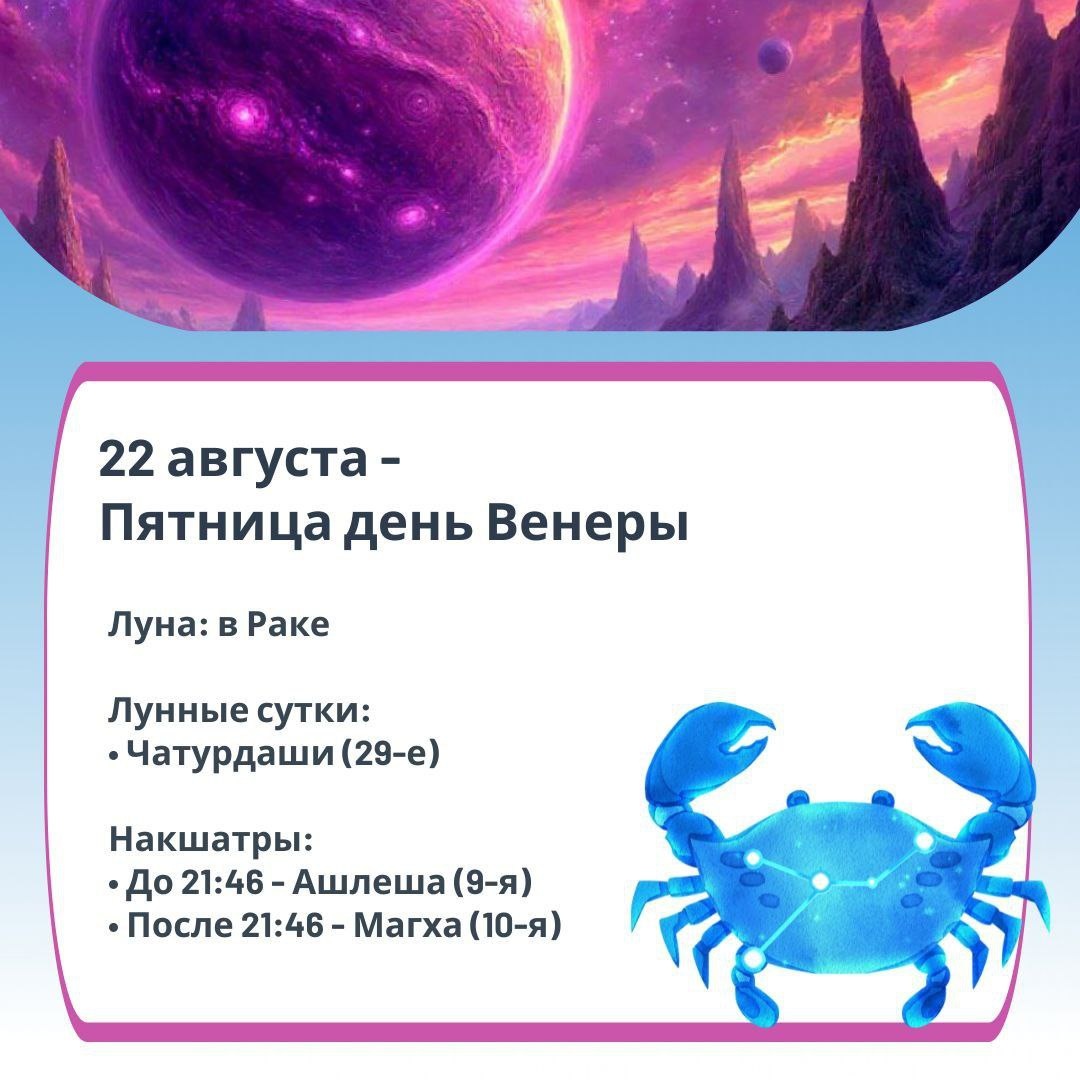 АСТРОДАЙДЖЕСТ НА ПЯТНИЦУ, 22 АВГУСТА 🌑 День, когда небо шепчет: «Начни с чистого листа». Это мощный день Венеры и Новолуния — время закладывать намерения, связанные с красотой, гармонией и отношениями. 🌙 ГЛАВНЫЙ АКЦЕНТ ДНЯ: НОВОЛУНИЕ В РАКЕ В 09:25 по Мск Луна встречается с Солнцем, знаменуя начало нового лунного цикла. Рак — знак дома, семьи, эмоций и глубоких корней. Это не просто новолуние, а момент emotional-перезагрузки. Вопросы, которые стоит себе задать: 🔠Что меня питает эмоционально? ·🔠От чего мне нужно исцелить свою родовую систему? 🔠Какое намерение, связанное с домом и чувством безопасности, я хочу заложить? Рекомендации на Новолуние: 🔠Практика тишины: Проведите утро (до 09:25) в спокойной обстановке. Помедитируйте, послушайте умиротворяющую музыку. 🔠Создание санкальпы: После 09:25 сформулируйте 1-2 ключевых намерения. Не материальные («хочу машину»), а эмоциональные и чувственные («хочу чувствовать себя в безопасности и уюте в своем доме», «хочу открыть сердце дл