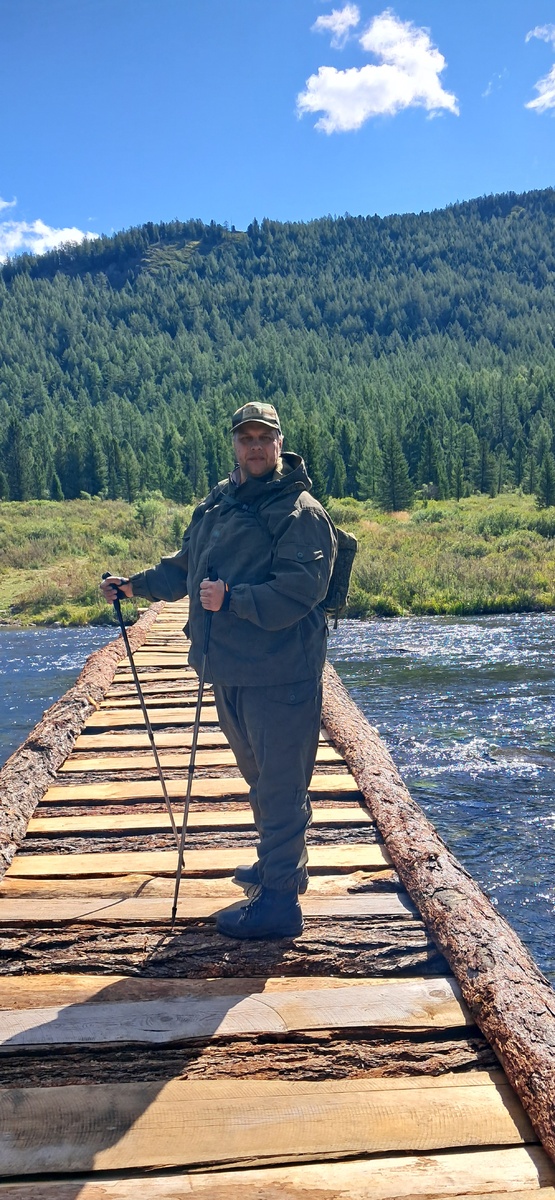 После моста дорога шла относительно ровно, совсем с небольшими перевалами. Я думал о том что на обратном пути даже эти маленькие подъёмы уже будут тяжёлыми. Перед рекой Куйгук мы немножечко посомневались, куда идти. Там была пробита новая дорога для квадроциклов, и было непонятно, лучше идти по ней, или идти по тропинкам в сторону реки. Сверившись с картой, решили идти по пешеходным дорожкам и они вывели нас на ещё один мост, по которому мы ходили раньше. Хотя, раньше мы шли немножечко левее мимо какой-то избушки.