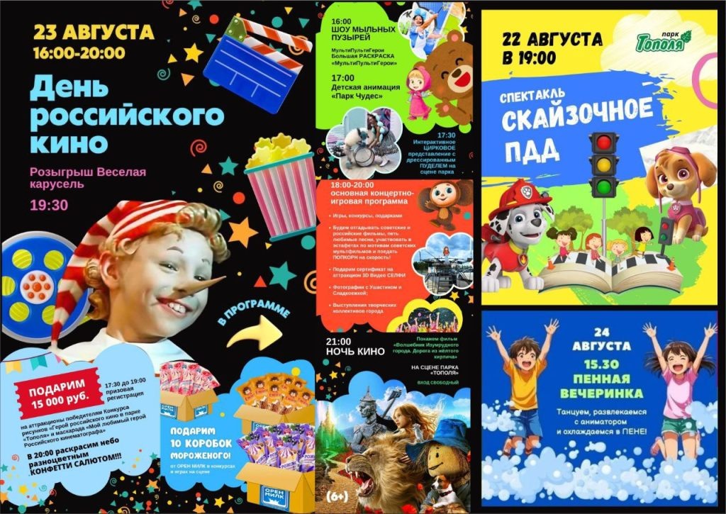 День Российского кино, пенные вечеринки и спектакль «СКАЙзочное ПДД» ждут гостей парка «Тополя» в эти выходные. 22 августа В 19:00 «СКАЙзочное ПДД». Юных оренбуржцев приглашают на интерактивное представление по правилам дорожного движения. 23 августа День российского кино в парке «Тополя» стартует с 16:00. В это время всех ждут на: В 17:00 популярная анимация с Машенькой и Мишкой и цирковой номер с пуделем. В 18:00 Концертно-игровая программа на сцене парка «Тополя». Здесь будет все: игры, песни, эстафеты, поедание попкорна на скорость. А украсят праздник творческие коллективы города. Победителей в играх на сцене ждут 10 коробок мороженого. А вот лучшим в конкурсе рисунков и костюмов по мотивам Российского кино подарят 15 000 руб. на аттракционы. В 20:00 небо парка «Тополя» украсит конфетти салют. А в 21:00 всех ждет фильм на открытом воздухе — «Волшебник Изумрудного города. Дорога из жёлтого кирпича» (6+) 24 августа. С 15:30 до 16:30 парк приглашает детвору на пенную вечеринку 25 авгу