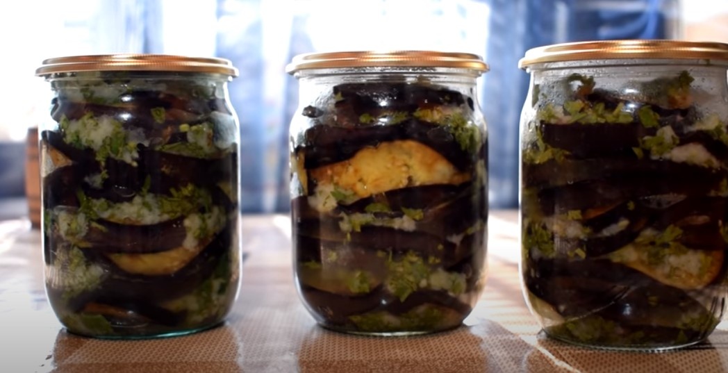 НЕОБХОДИМЫЕ ПРОДУКТЫ: 6 кг баклажанов; 0,5 литров растительного масла; 4 красных болгарских перца; 4 перца Чили; 10 головок чеснока; 0,5 литра 9% уксуса. Для рассола. 5 литра воды; 1 стакан крупной соли. ПРИГОТОВЛЕНИЕ: 1. Овощи вымойте. Перцы и чеснок измельчите в блендере/мясорубке. Смешать с растительным маслом и уксусом. 2. Баклажаны вымойте. Нарежьте четвертинками, опустить в кипящий рассол, варить 7 минут. Затем сложить в подготовленные банки, чередуя с овощным пюре. Стерилизуйте банки 20 минут. Закатать. Перевернуть. Укутать.