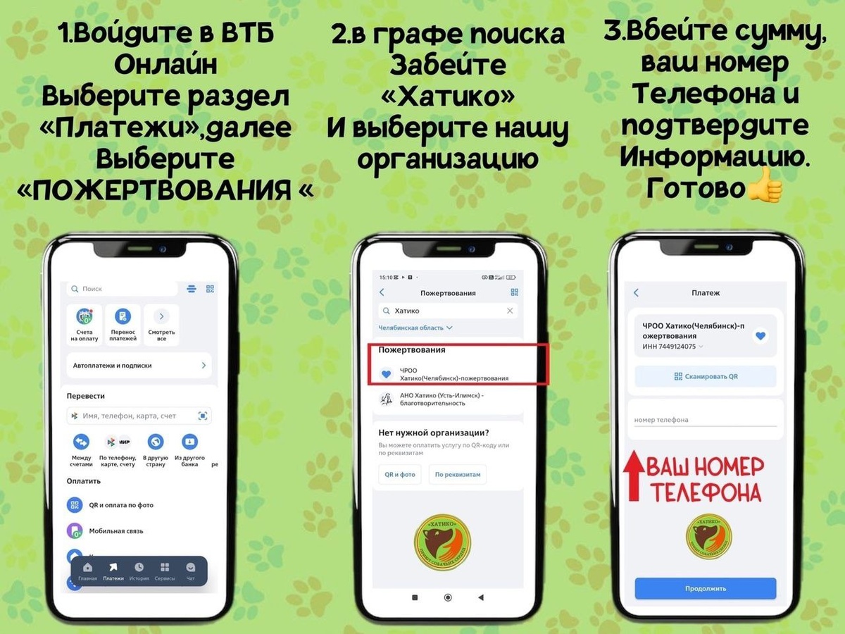 Приют для бездомных животных "Хатико" г.Челябинск размещен в рубрике «Пожертвования» банка ВТБ. Перевести денежную помощь можно через приложение ВТБ-онлайн на телефоне.При таком виде пожертвования средства поступают сразу на официальный расчетный счет нашей организации в Банке. Действия для перевода простые: 1) Зайти в раздел "ПЛАТЕЖИ" 2) Пролистать вниз до раздела «ПОЖЕРТВОВАНИЯ» 3) В поиске вверху ввести название приюта – «ХАТИКО г.ЧЕЛЯБИНСК» 4) Вписать сумму и ВАШ номер телефона,нажать "ПРОДОЛЖИТЬ" 5) Далее подтвердить свои данные и провести платеж. Средства приходят на счет приюта полностью, без снятия комиссии.