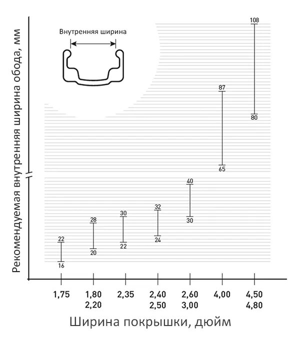 Слишком узкий обод: меньшее сцепление и устойчивость на поворотах, шина может сгибаться во время поворота. В таблице ниже указаны рекомендуемые минимальная и максимальная внутренняя ширина обода для каждой ширины покрышки горного велосипеда. Если вы решите использовать комбинацию, выходящую за рамки рекомендаций, то можете столкнуться с негативными последствиями для формы и функции шины.
