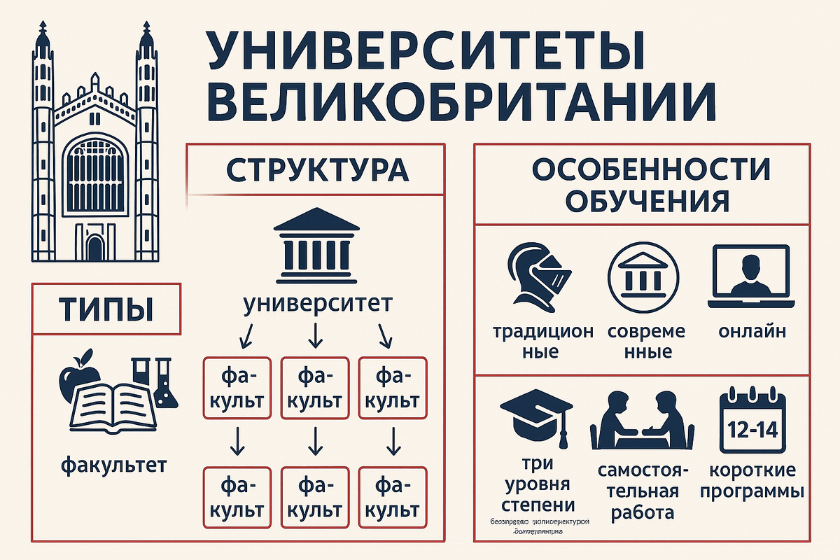 Университеты Великобритании входят в число старейших и наиболее престижных в мире. Именно здесь расположены такие легендарные вузы, как Оксфорд и Кембридж, а также десятки современных исследовательских центров мирового уровня. Дипломы британских университетов высоко ценятся работодателями по всему миру, а конкуренция за места — одна из самых высоких среди иностранных студентов. В этой статье мы подробно разберём систему университетов в Великобритании: их типы, рейтинг, условия поступления, стоимость обучения и перспективы для студентов. Британская система высшего образования разнообразна. Все университеты делятся на несколько категорий: Великобритания занимает ведущие позиции в мировых рейтингах. Несколько университетов стабильно входят в топ-10 лучших вузов мира. Стоимость зависит от университета, программы и уровня образования: Дополнительно студенты оплачивают проживание (£800–1200 в месяц), питание и личные расходы. Иностранные студенты поступают через систему UCAS (Universities an