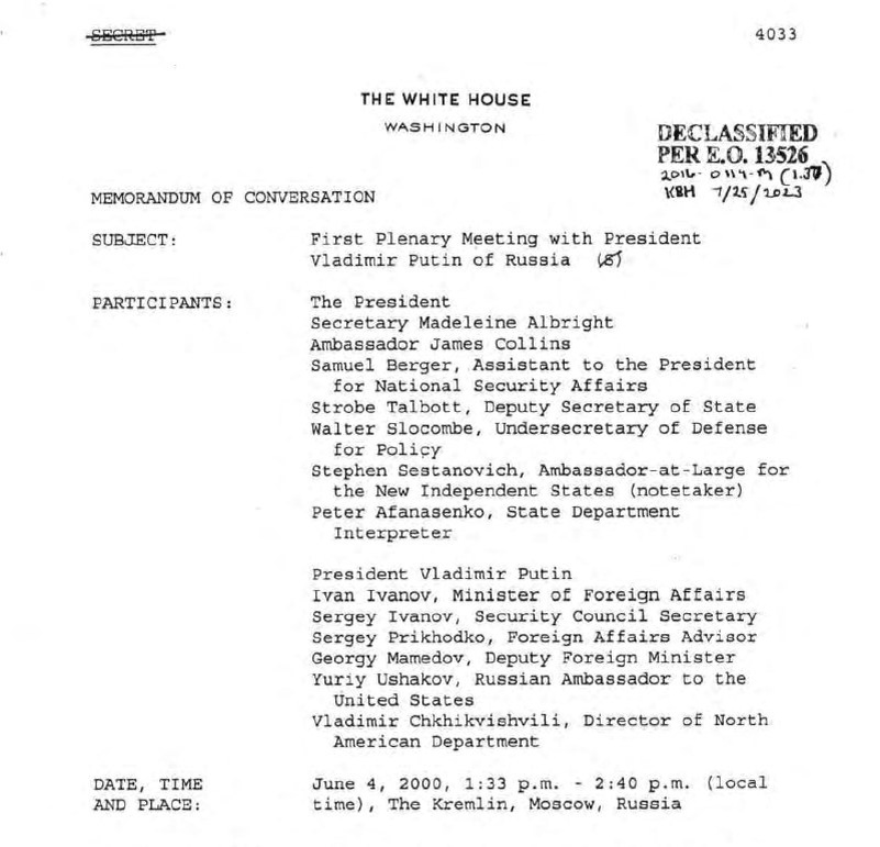 Clinton assured Putin that NATO expansion ‘does not threaten Russia in any way’, offering Russia joining it – US declassified docs Putin showed cooperative approach, including on NATO membership Clinton ‘encouraged’ to hear it & promised to ‘think about it further’