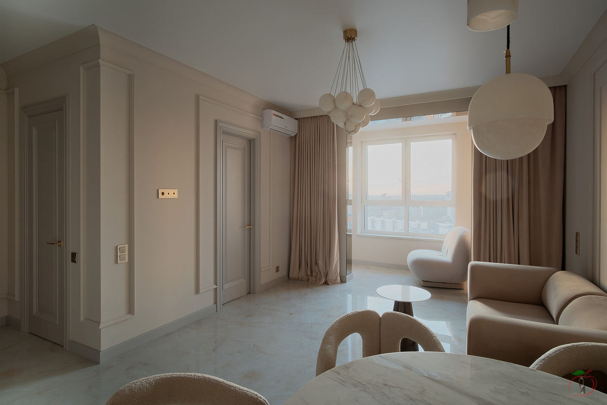 Интерьер квартиры выполнен в современном стиле. Выбрана мягкая натуральная палитра. Используются элегантные линии и стильные акценты,создающие атмосферу светлого и уютного пространства. Рациональное использование пространства с продуманным зонированием делает помещение более организованным и удобным.