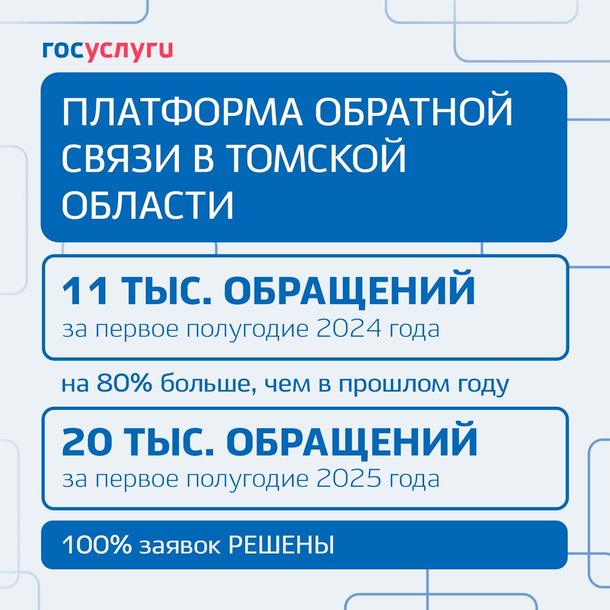 Жители Томской области оставили более 20 тысяч обращений через Платформу обратной связи за первые полгода 2025 года. Все заявки были рассмотрены и по ним приняты решения.