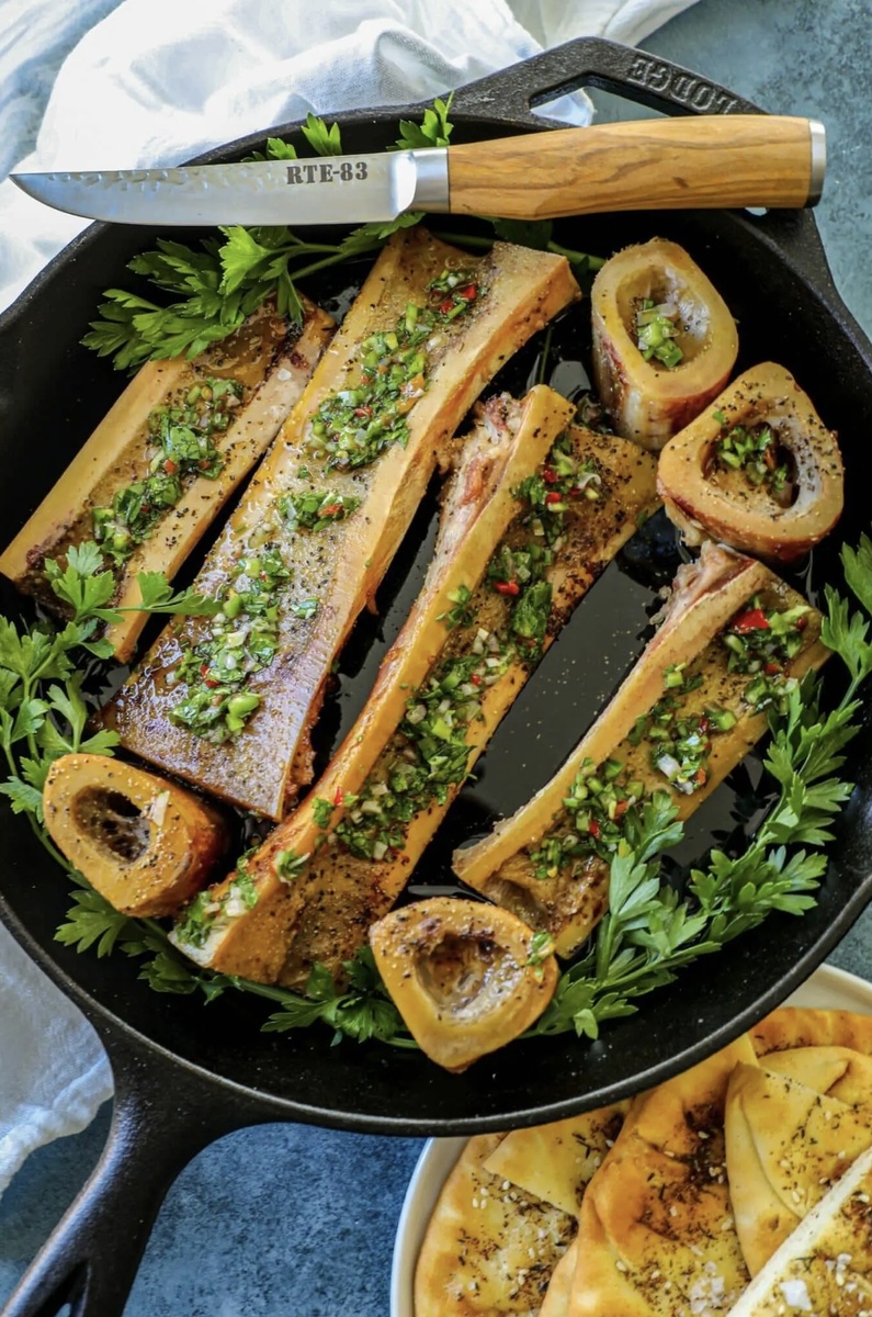 Этот насыщенный и восхитительный рецепт костного мозга превращает обычную косточку в изысканный деликатес, который идеально сочетается с хрустящим хлебом или служит роскошным гарниром к стейку. Вкусный деликатес: костный мозг, или мясное масло, — это деликатес, который вы найдете в ресторанном меню по внушительной цене. Но вы можете приготовить этот маслянистый деликатес дома по этому простому рецепту. Костный мозг, приправленный простой солью, перцем и чесноком, а также посыпанный свежей зеленью, идеально подходит в качестве замены сливочному маслу. Он обладает насыщенным копченым вкусом и богат коллагеном и омега-3! Ингредиенты: • 2 кг костного мозга, любой вариант нарезки подойдет • вода для замачивания • 2 ст. л. соли для замачивания • 2 ст. л. соли, перца и чеснока/ приправы для барбекю • свежая зелень Подготовка: День первый (за 24 часа): 1. Достаньте костный мозг из упаковки. Срежьте с костей лишний жир и мясо. 2. Положите кости в большую емкость, залейте водой и добавьте соль