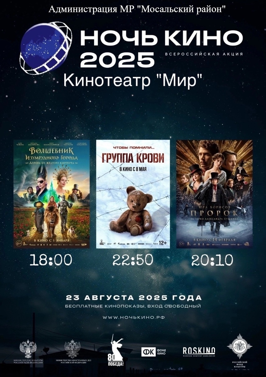 🎥 Юбилейная 10-я акция «Ночь кино 2025» пройдет уже завтра в кинотеатре "Мир"! В программе – военная драма «Группа крови» и хиты российского кинопроката «Волшебник Изумрудного города. Дорога из желтого кирпича» и «Пророк. История Александра Пушкина». ⏰Начало в 18:00. Вход свободный #АдминистрацияМРМосальскийРайон 🙌