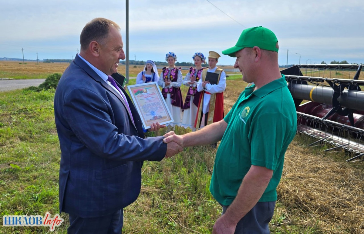 ⚡️Комбайнер ОАО «Александрийское» Виктор Воронов первым в районе преодолел рубеж в 3 тысячи тонн намолоченного зерна. ✅Торжественная церемония чествования прошла прямо на поле, где трудится хлебороб. ➡️Поздравили с почетным трудовым рубежом Виктора Николаевича председатель райисполкома Сергей Бартош, председатель районной организации Белорусского профсоюза работников агропромышленного комплекса Алексей Дедков и представители сельхозпредприятия. 💫Лидеру были вручены награды и подарки. Настроение и торжественность моменту придали музыкальные композиции от работников культуры.