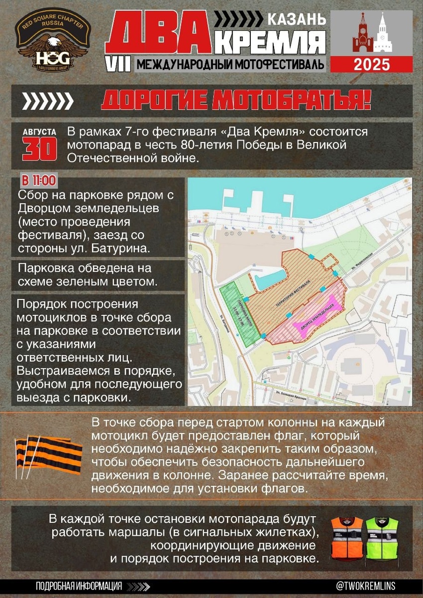 🔁 Дальняк.рф™: ❗️❗️❗️ Внимание! Всем желающим принять участие в мотопараде: 🤘Долгожданная информация! Построение мотопарада начнётся в 11:00 на парковке рядом с Дворцом земледельцев (место проведения фестиваля). Заезд со стороны ул. Батурина. ✅ Ознакомьтесь с важной информацией во вложении Участие в мотопараде возможно только при движении организованной колонной из указанной точки сбора. Одиночные мотоциклы, не прошедшие инструктаж в точке сбора, допускаться в колонну не будут.