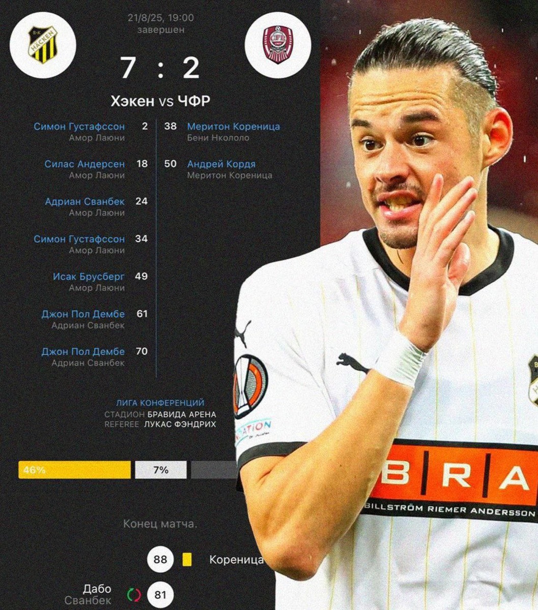 5 голевых за 50 минут – такое шоу устроил игрок «Хэкена» Амор Лаюни в матче отбора Лиги конференций против ЧФР! За всю игру парень совершил всего 39 касаний, а его команда уничтожила румынский клуб со счетом 7:2