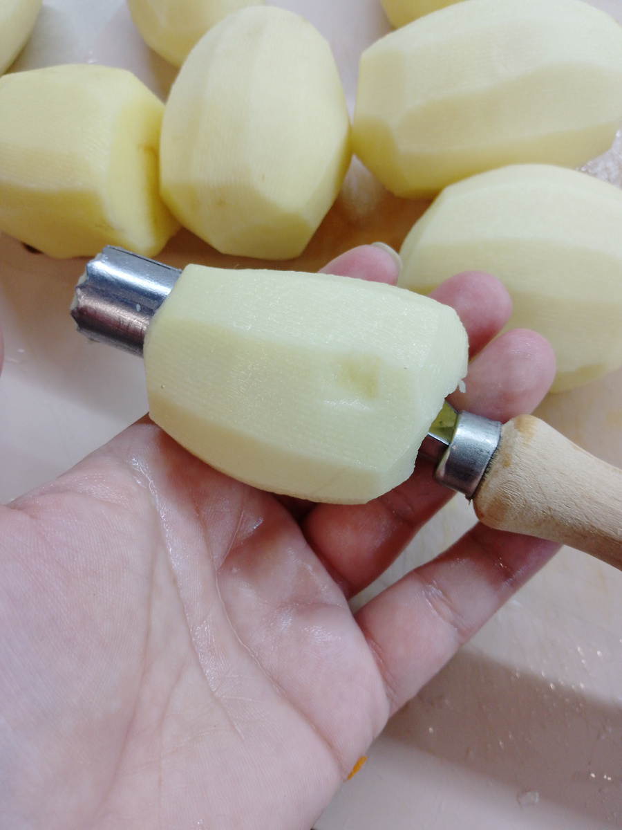 Картофель с мясом, что может быть вкуснее? Только фаршированный картофель 😉 Для этого блюда понадобятся мелкие клубни картофеля. Чистим и делаем в середине отверстие. Я его делаю с помощью ножа для удаления огрызков из яблок. Если картофель крупноный и дырочка получается маленькая её можно сделать чуть больше с помощью все того же ножа. Серцевинки картофеля можно использовать, например, для супа. Фарш. Тут ничего особенного. Добавьте в него, то что Вам нравится: лук, чеснок , любимые специи. С помощью чайной ложки плотно нафаршируйте картофель. В сотейнике сделайте зажарку. У меня лук и морковь. Можно добавить любые овощи, которые Вам нравятся. Далее, добавите ложку томатной пасты, соль и перец по вкусу. Если томатной пасты нет можно воспользоваться кетчупом, в таком случае, сахар не добавляйте, так как в составе кетчупа его достаточно много. Выкладываем картошку. Можно в несколько рядов. Заливаем водой. Соль, перец горошком, лавровый лист и Ваши любимые ароматные травы. Я